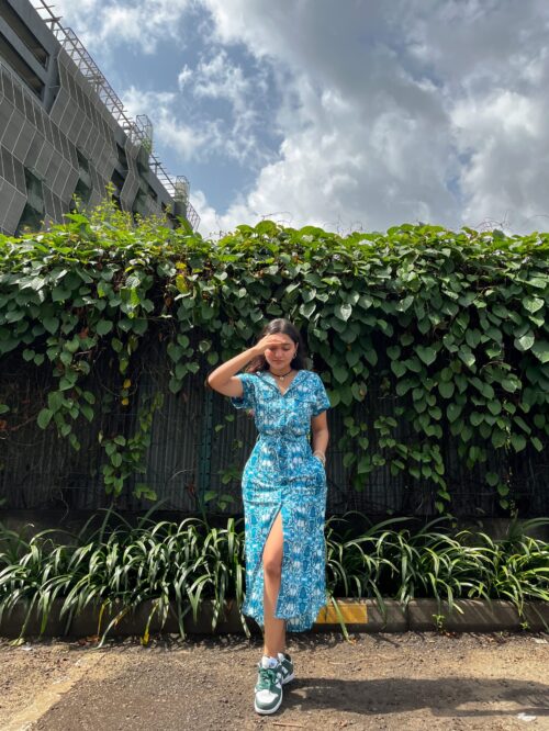 This sunny wrap midi is cut from printed cotton , chicest midi dress to take you from the park to the rooftop bar all summer.The real highlight is an exclusive print ,bursts of blue summer motifs guaranteed to light up a room.Define your waist by knotting the belt around it.
